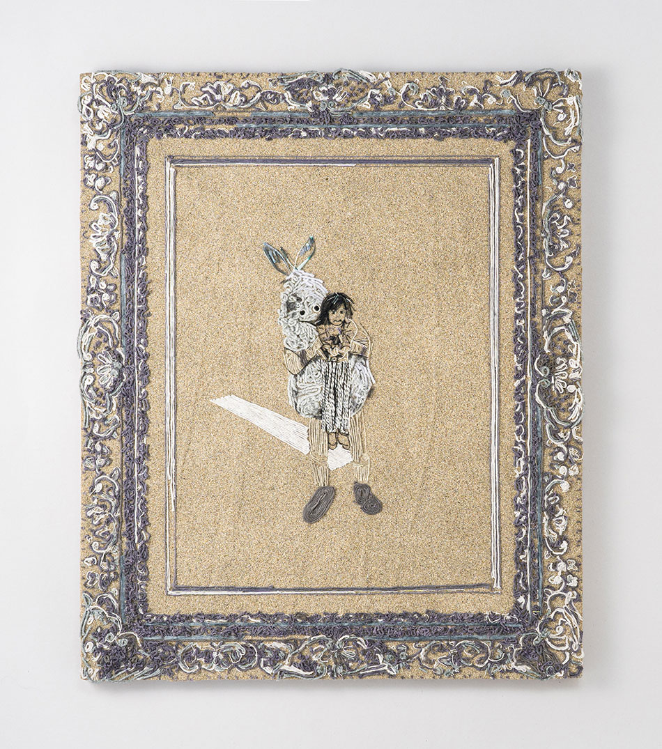 Drawing is created when the fine fibers of thread are entangled in the unevenness of sand particles. Assuming that since this world was born from minerals, sand would be a relatively ubiquitous material in any place on earth, I am researching painting with sand as a canvas even if there is only thread around us. The size of the particles also changes the fixation of the threads. Wind, the flow of time, and the pull of the threads cause the threads to peel off from the canvas and circulate.