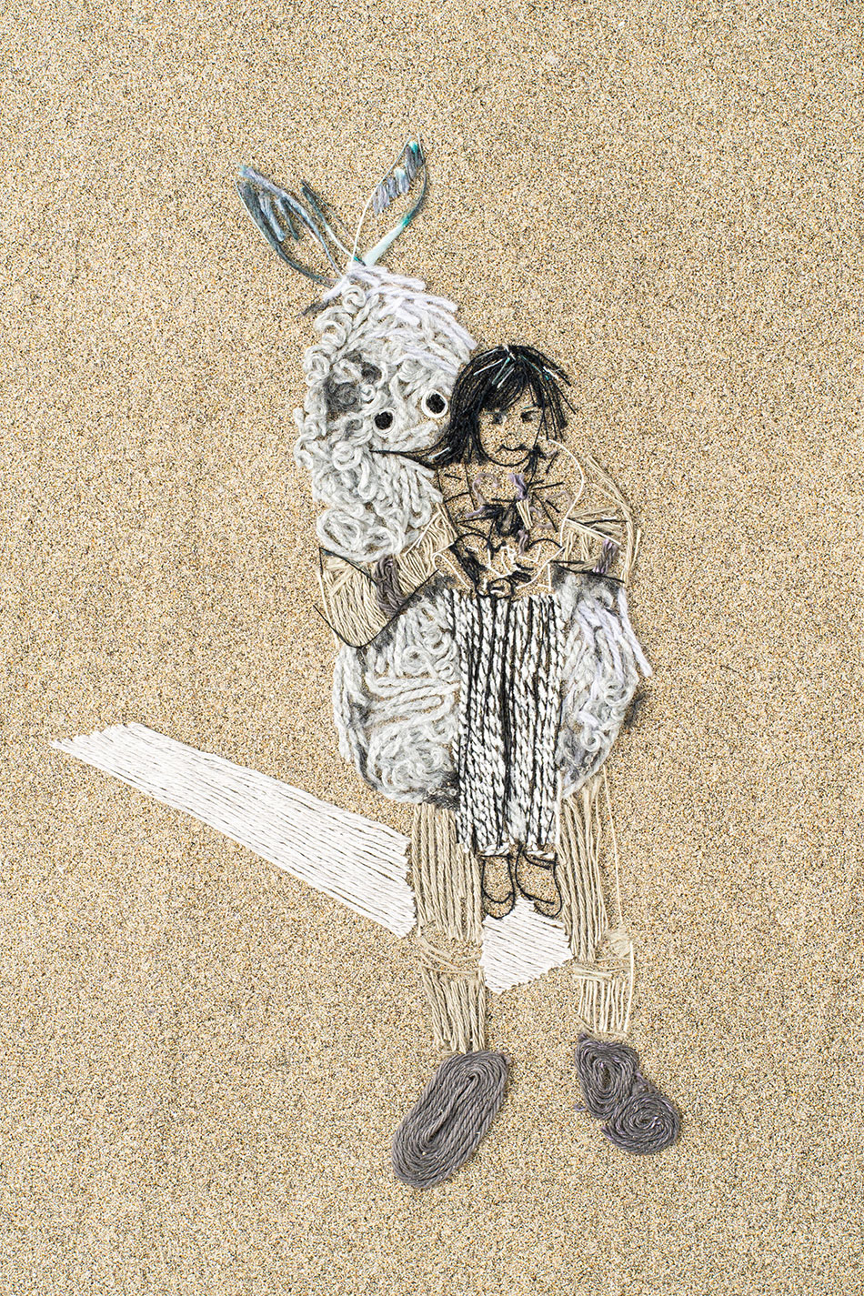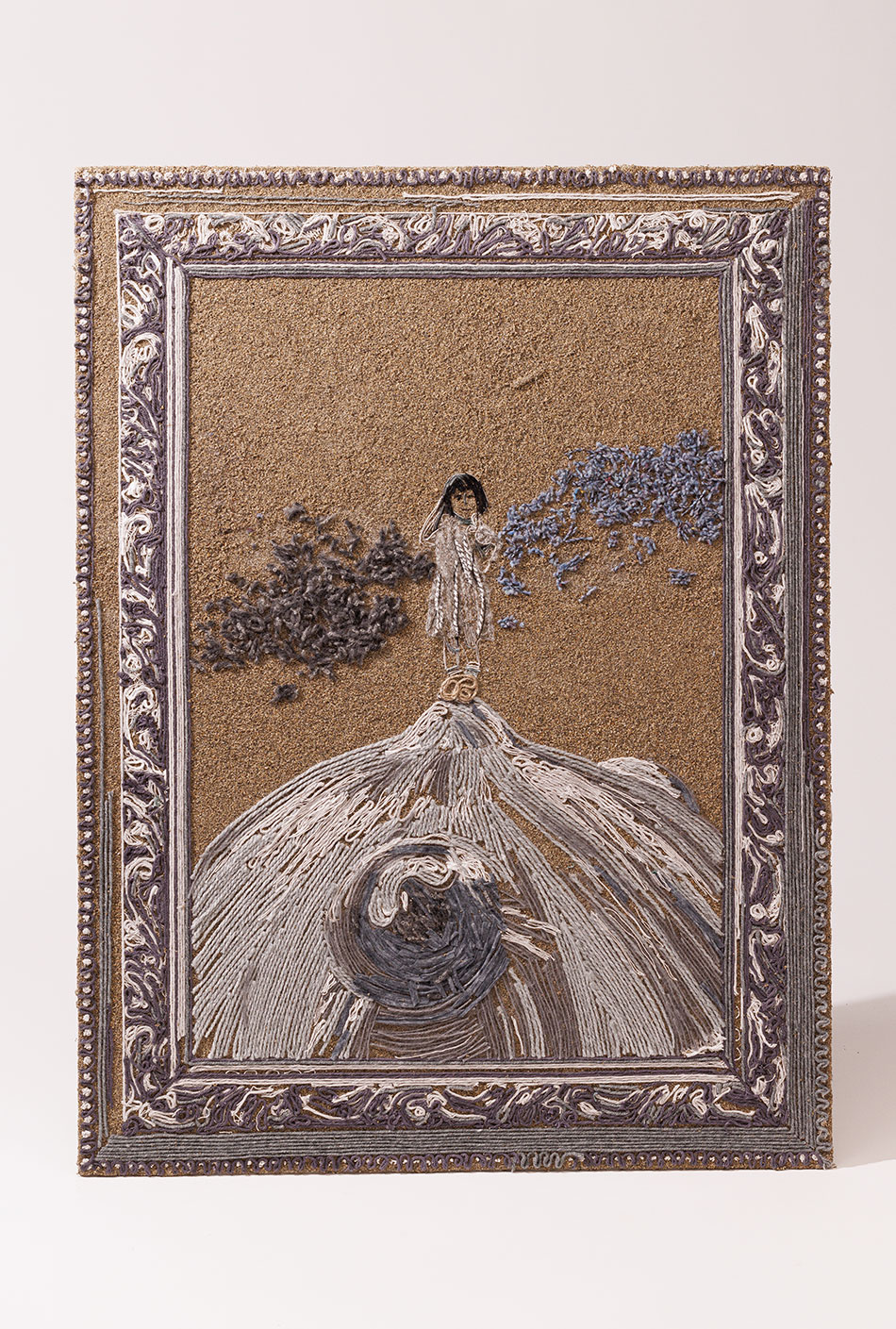 砂の粒子が作る細かな凹凸に糸の微細な繊維が絡みついて定着をすることで描かれる絵画。この世界は鉱物が素で生まれたから、地球上どんな場所でも砂は比較的どこにでもある素材だろうと仮定し、糸しかなくても砂をキャンバスに絵を描くことを研究している。粒子の大きさによっても糸の定着度が変わる。風や時の流れや糸を引っ張ることによってキャンバスから糸は剥がれ、循環する。