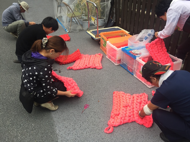 そこで住民同士の議論の末、眼鏡橋に再度ニットを戻すのではなく、眼鏡橋を包んでいたニットを一度ほどき、そのニットを使って個人個人が想い想いの眼鏡橋を再構築するという展開となりました。眼鏡橋付近のまちぶら広場にて、柵を使って表現したり、持って帰れるようなものを作って家に飾る参加者もいました。