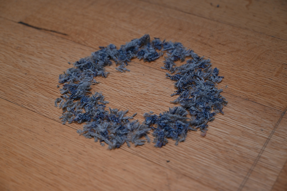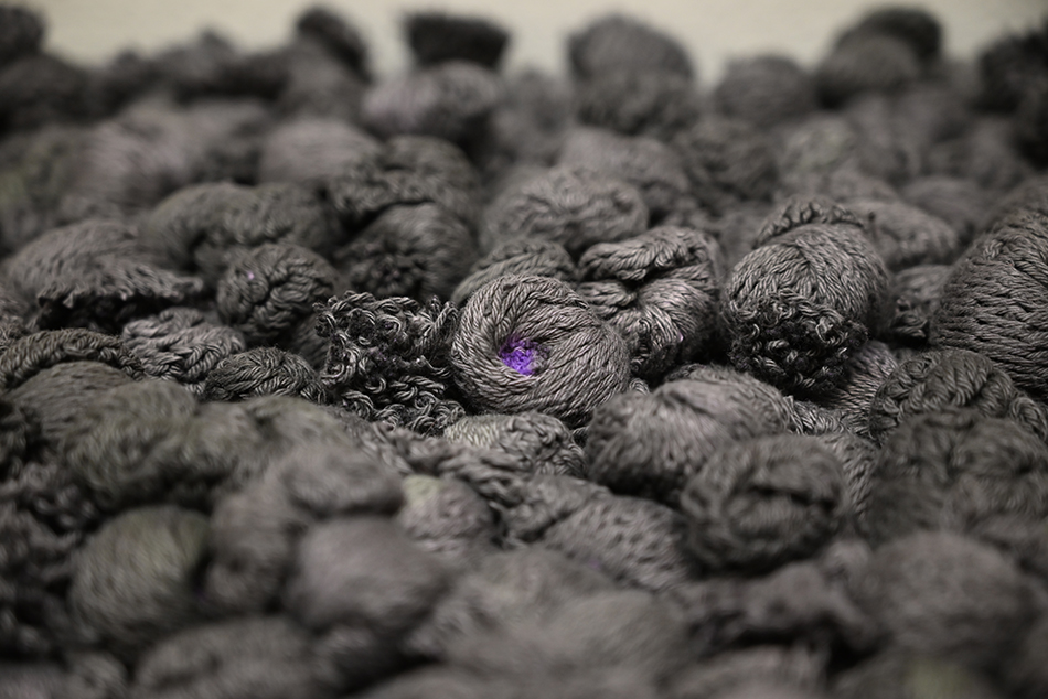 Pigment-dyed and bio-washed surplus thread, bengals-dyed surplus thread, surplus thread, pencil, watercolor paints, drawing paper