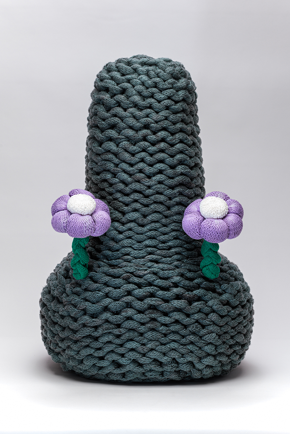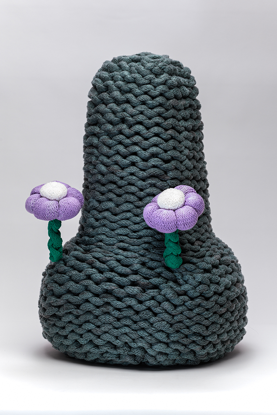 化学繊維を編んで作った化学繊維のお墓である。使っている糸は、これまで自分を様々な人や場所とつないでくれたものだ。今後はその場にある素材を編んで作品を作りたいので、倉庫に眠っている1トンもの糸をどうしようかと考えていて、糸の原料や糸にまつわる様々な思い出など糸自体が持つネットワークに想像をめぐらすようになった。