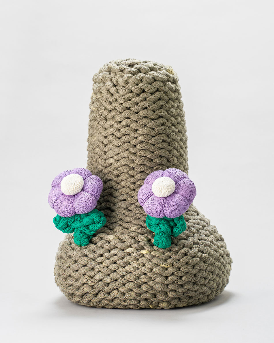 石が積み重なった日本の墓のデザインは仏教の五重の塔を簡略化したものであり、先祖供養の場、成仏を願うものという意味合いがある。下から段々と編んでいく行為はまるで死者を追悼する石積みの行為のようであり、重ねられる編目模様は石油が産出される地層を彷彿とさせる。